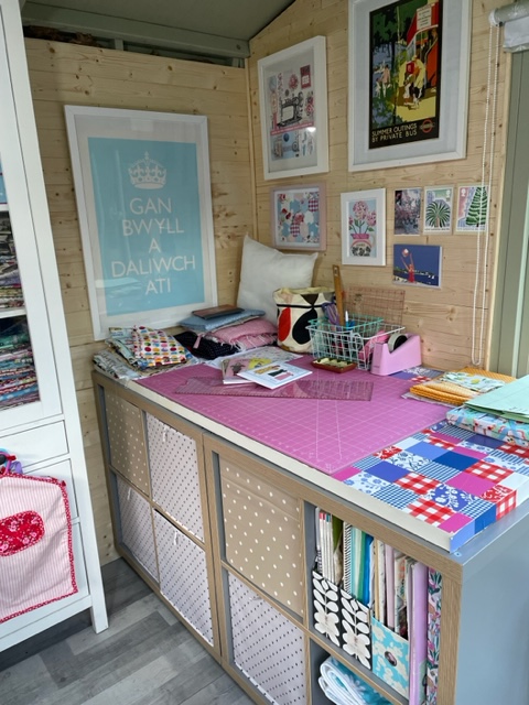 Next step was levelling sand and concrete to enable the slabs to be laid down properly, which wasn’t too bad apart from lifting 42 heavy slabs! All set for delivery and installation. So 7.30am a few weeks later the installation guys arrived from The Malvern Collection. By lunchtime the garden office was up and ready for action! Not quite, as actually it turned out to be quite cold despite a heater. DIY friend came again and we fitted insulation, roller blinds and a big rug, all from Dunelm. Plus the lighting! Then the next process of moving in! The fun bit! I moved my trestle table desk from Ikea and my fabric cupboard. I needed quite a bit of storage for crafting and fabrics supplies. I needed a large cutting table with storage, however all the ones I looked at were extremely expensive so I had a look around the web and found the Ikea hack website which came up with the brilliant idea of assembling 4 Kallax units together to make a large table. We added castors and an old pasting table on the top. The pasting table had seen better days so I covered it with a Fablon vinyl covering featuring a pink and blue patchwork design. Perfect.