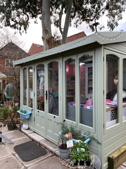 I had always wanted a garden office, who wouldn’t? I had looked at them for years dismissing the expense, however since my Etsy shop really took off during covid, I have. like many people, been working from a desk in the house. This involved commandeering the dining table for cutting out and making use of the ironing table which was up permanently. I’d got fabric stashed away in so many places, that I lost count and started to begin to not find things. Okay, that was probably peri-menopause too! I’m an organised and tidy person but eventually this drove me mad! I had had enough! I went with my afore mentioned DIY friend to the local large garden centre and fell in love instantly with the most glorious sage green coloured little garden office. It was as though the gods were speaking to me as until the end of September, there was £1000 off. I had 3 days to think about it. The price was nowhere near as bad as I thought it would be and I was pleasantly surprised. As the estate agent said, it will definitely add value to your house, as lots of people have changed the way they work and are now home based, so an office that you can shut the door on at night is a godsend. I didn’t think about it for too long and phoned up and ordered it the next day. A delivery estimation of 10 weeks was given, which would bring me to just before Christmas. Plus plenty of time to lay concrete slabs and sort out the garden.