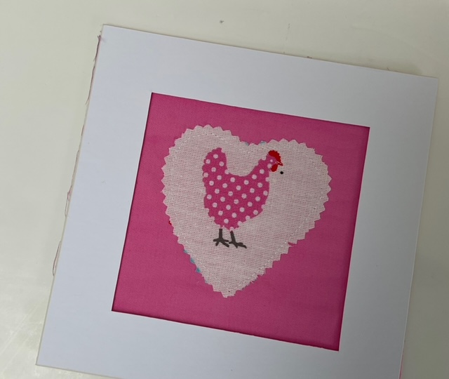 Lastly we have the spotty pink hen heart picture. This was inspired by my love of hens and the rescue chickens we have had over the years. A pretty pink spotty hen is cut into a heart shape and appliqued onto a bright pink background. Perfect for those hen lovers out there!