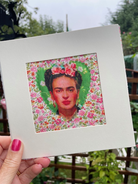 I have been trying out a new line of products lately at Lizzyshomemade. Fabric art! Over time I have amassed lots of fabric scraps and I have been trying to think of different ways to use the material. My first excursion into textile pictures has been with a Frida Kahlo fabric. I love this fabric which is a repeat pattern of Frida’s head on a vibrant green background. I have added a pretty pink Liberty of London fabric as the background in this picture. I must admit I do like the result. The two fabrics contrast nicely with one another.
