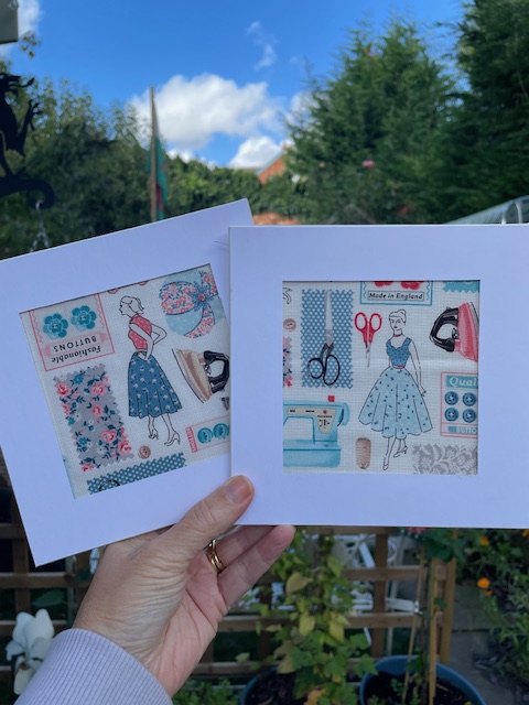 I love 1950’s style of fashion and couldn’t resist making these lovely pictures from a beautiful sewing notions fabric that I have featuring a 1950’s ladies iconic outfit of a full skirt and fitted top. Other sewing and craft items are pictured, including old fashioned buttons and sewing machines. I just love this fabric!