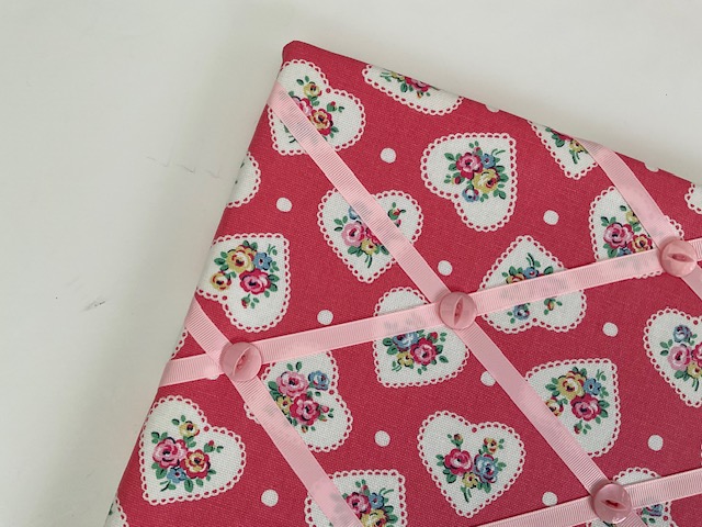 Another new addition to my Etsy shop has been this lovely little memoboard. I sell lots of memoboards but I hadn’t made one in this particular fabric, until requested by a customer. The fabric is a Cath Kidston print featuring large white hearts filled with flowers, all on a cerise pink background. Although I had made sewing cases and storage bags with this fabric, I really do think it looks great as a memoboard. It would certainly brighten the place up.
