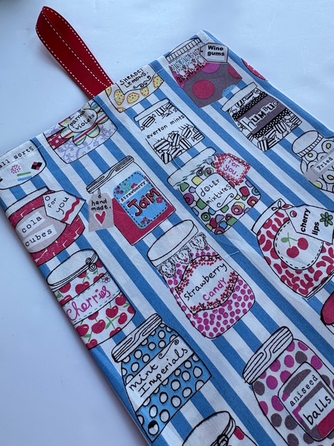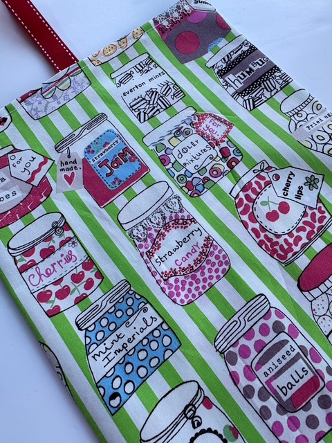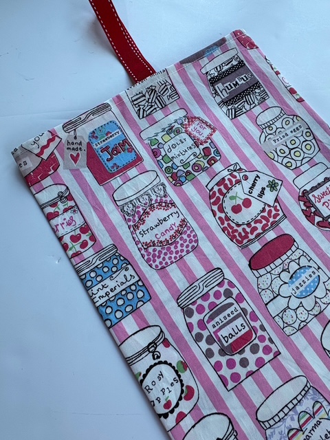 In keeping with the vintage and retro theme, although slightly in a more modern fashion, I have made these cheerful grocery bags holders, which prove extremely useful for storing plastic bags in my house. I just love this fabric of retro sweet jars and happily discovered it came in pink, blue and green too!