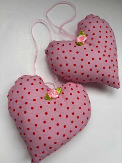 Back to pink spots now! It has been nice to have time to experiment with some playful products too. These hanging hearts are made from an old Cath Kidston Rosalie fabric. Featuring a pale pink with tiny red dots, they are so sweet! The hearts come with a pretty see through pink ribbon to hang them up by and have a pale pink fabric rose at the top. Just in time for Valentine’s day!