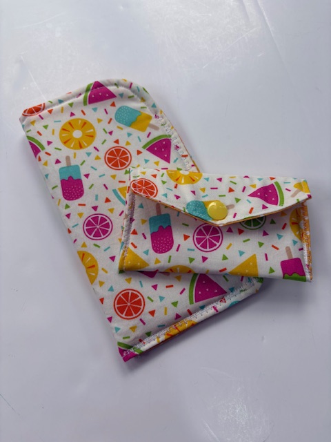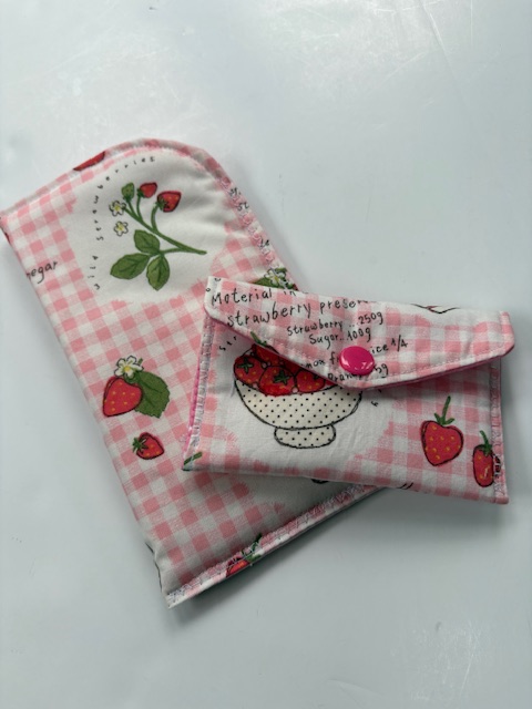 With the weather improving and the start of Spring, I’ve made a couple of new sunglasses holders with matching small wallets. The first features the iconic summer theme of strawberries, on a pink gingham fabric and then we have a quirky retro ice-cream print, featuring retro sweets and watermelons.